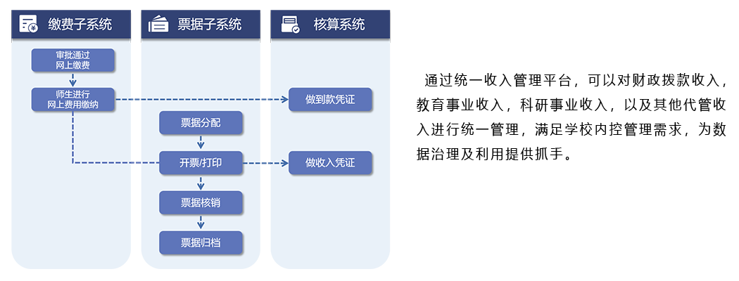 复翼缴费平台与票据管理系统无缝对接,通过接口支持开具非税电子票,非税一般缴款书,增值税电子发票,以及我们往期介绍过的数电票;同时,也与账务系统无缝整合,实现缴费信息,票据信息和账务信息的互联互通。
